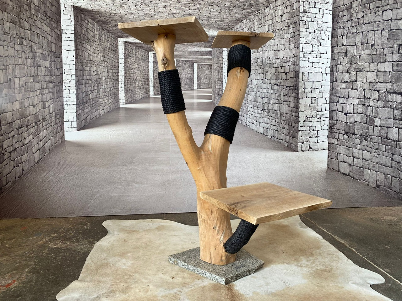 Katzenbaum aus Walnuss auf Steinplatte (polygonal) mit 3 Ebenen aus Eichenplatten eckig ca. 40cm x 40cm (gewachst) mit Sisalseil schwarz – H: ca. 150cm B: ca. 150cm T: 120cm – 590,00€