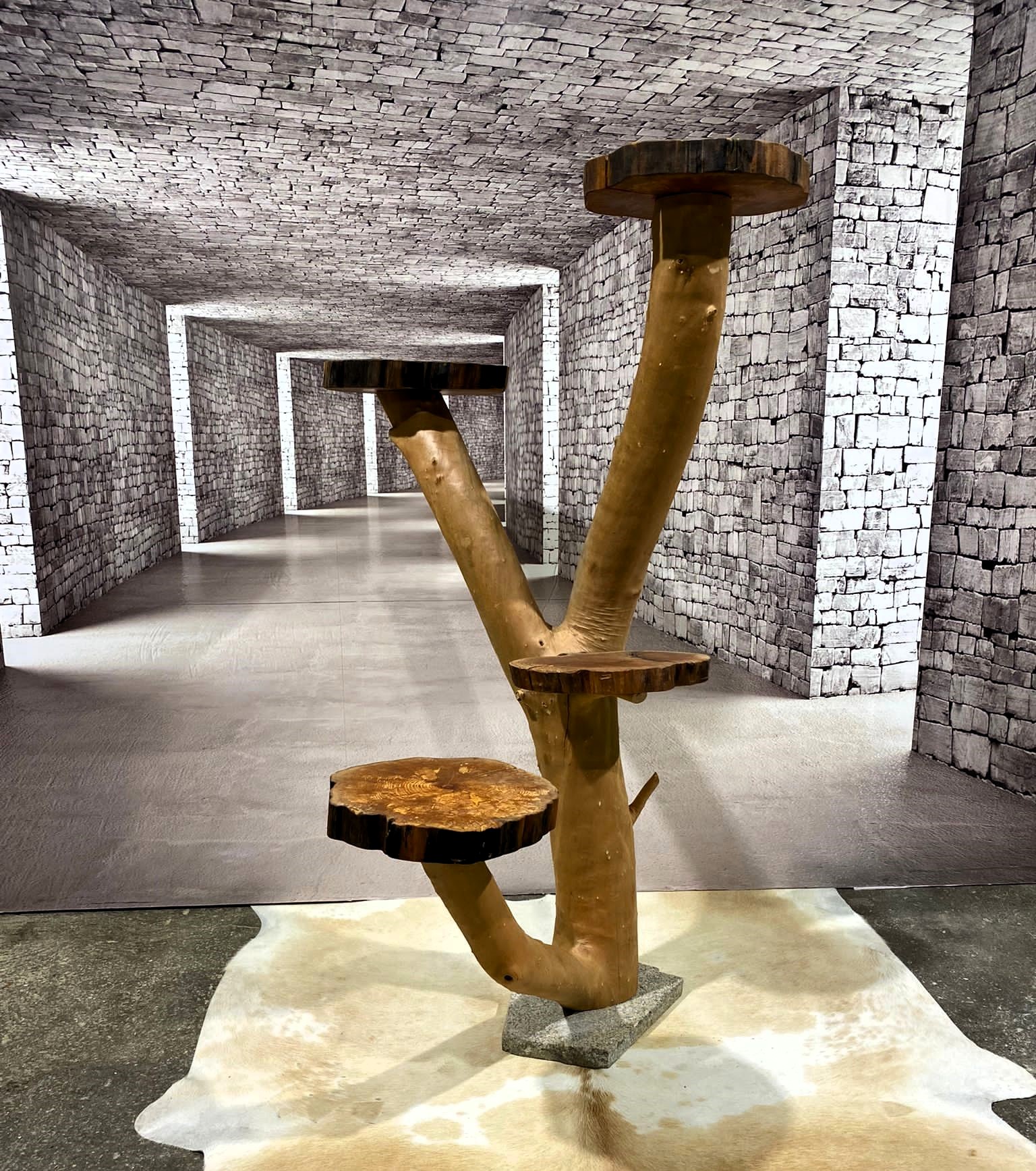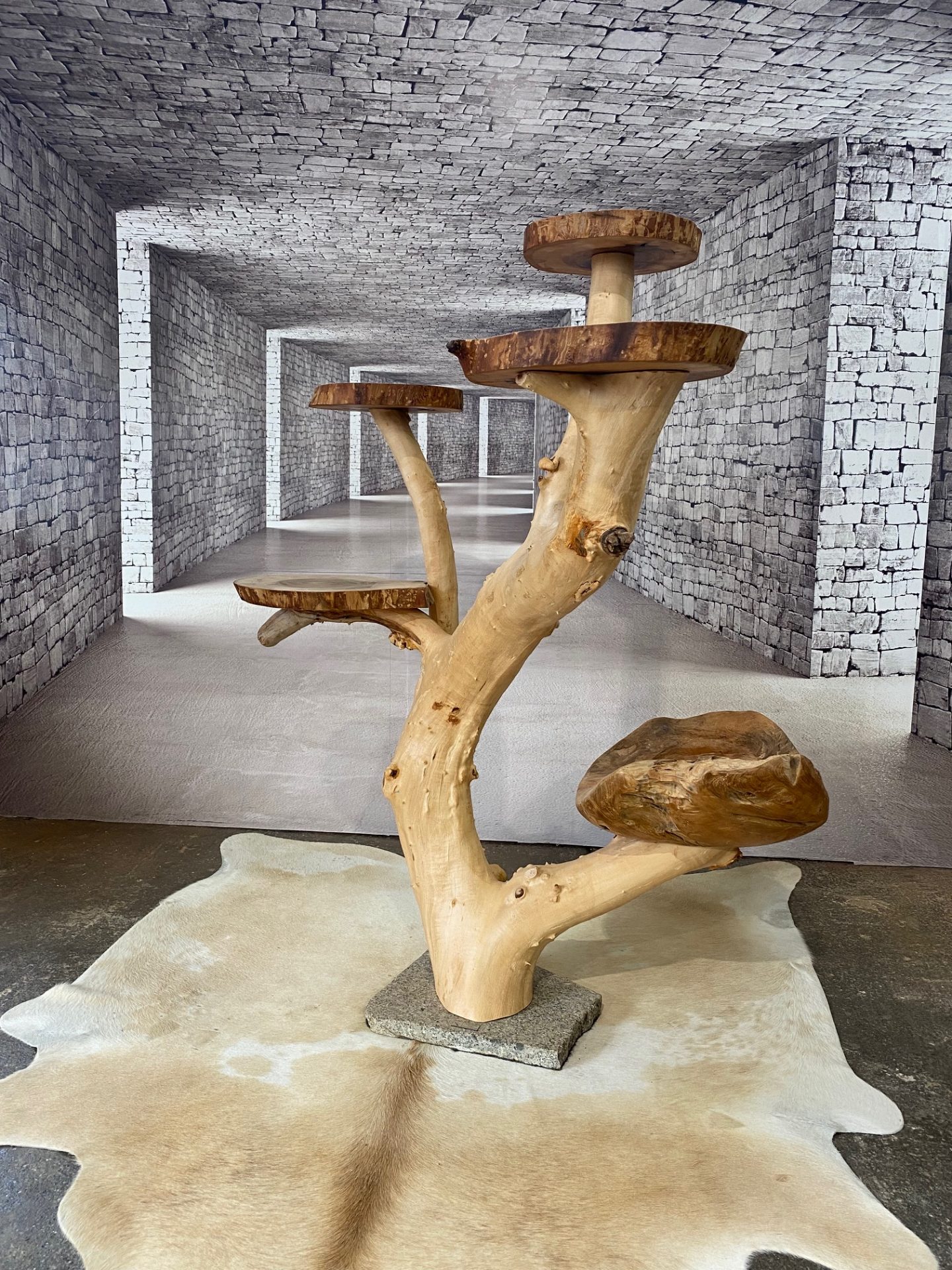 Katzenbaum-Rohling aus Apfel auf Steinplatte (polygolnal) mit 4 Ebenen aus Birnenscheiben Durchmesser ca. 35-44cm und einer Teakholzschale ca. 45x50cm (geölt) H: ca. 165cm B: ca. 130cm T: ca. 150cm , kann beliebig mit Sisalseil ausgestattet werden – 850,00€