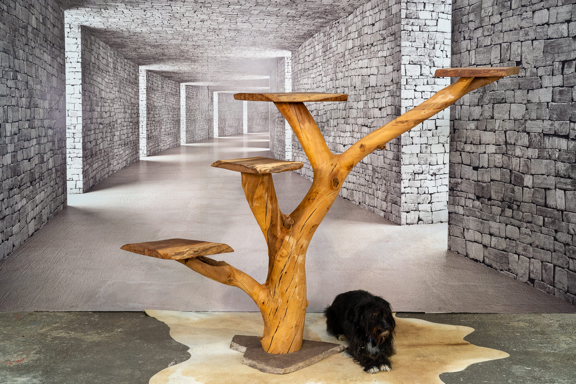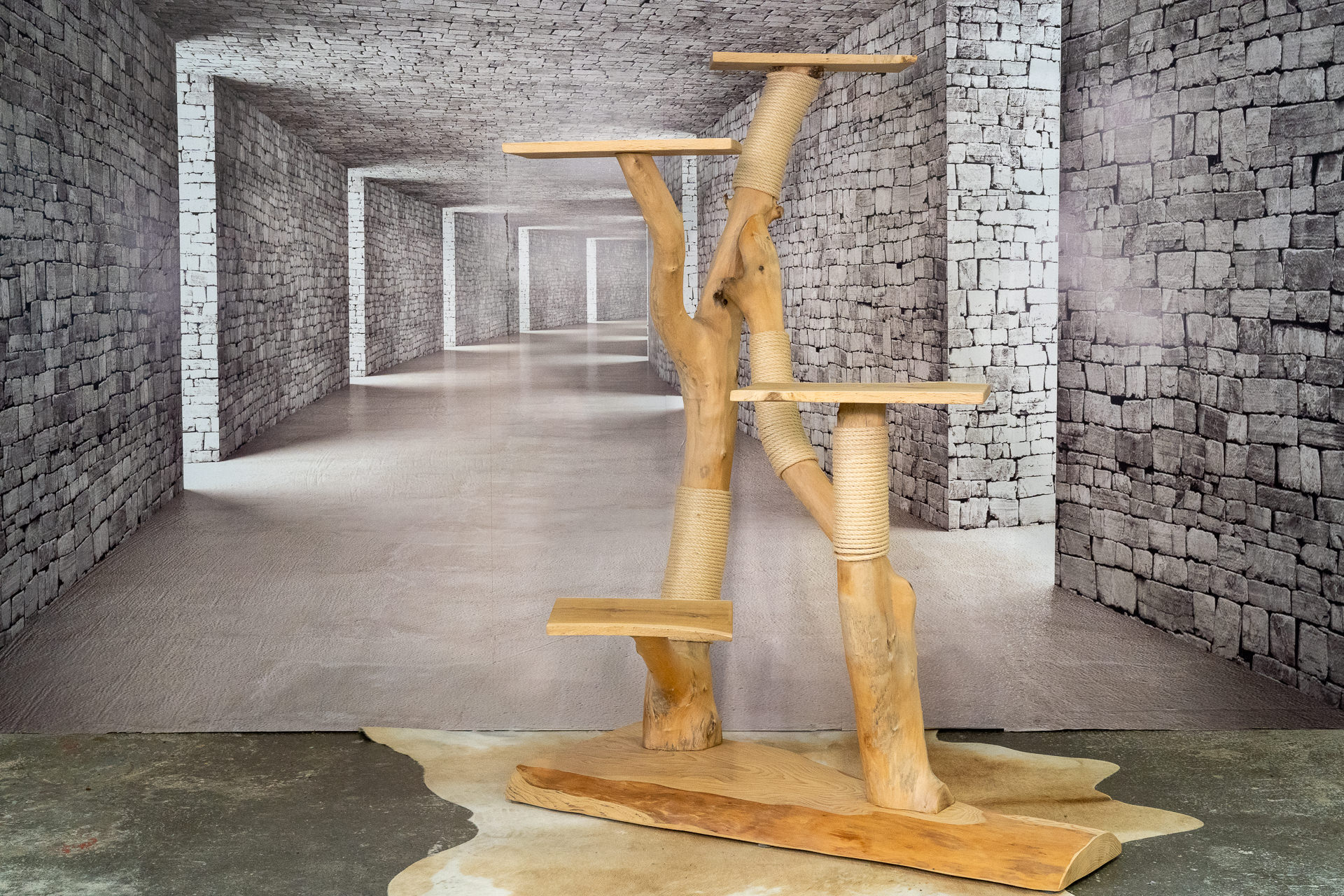 Katzenbaum-Rohling aus Kirsche auf Steinplatte (polygonal) mit 4 Ebenen aus Eichenplatten eckig je ca. 45x35cm (geölt) – H: ca. 160cm B: ca. 200cm T: ca. 110cm, kann beliebig mit Sisalseil ausgestattet werden – 890,00€