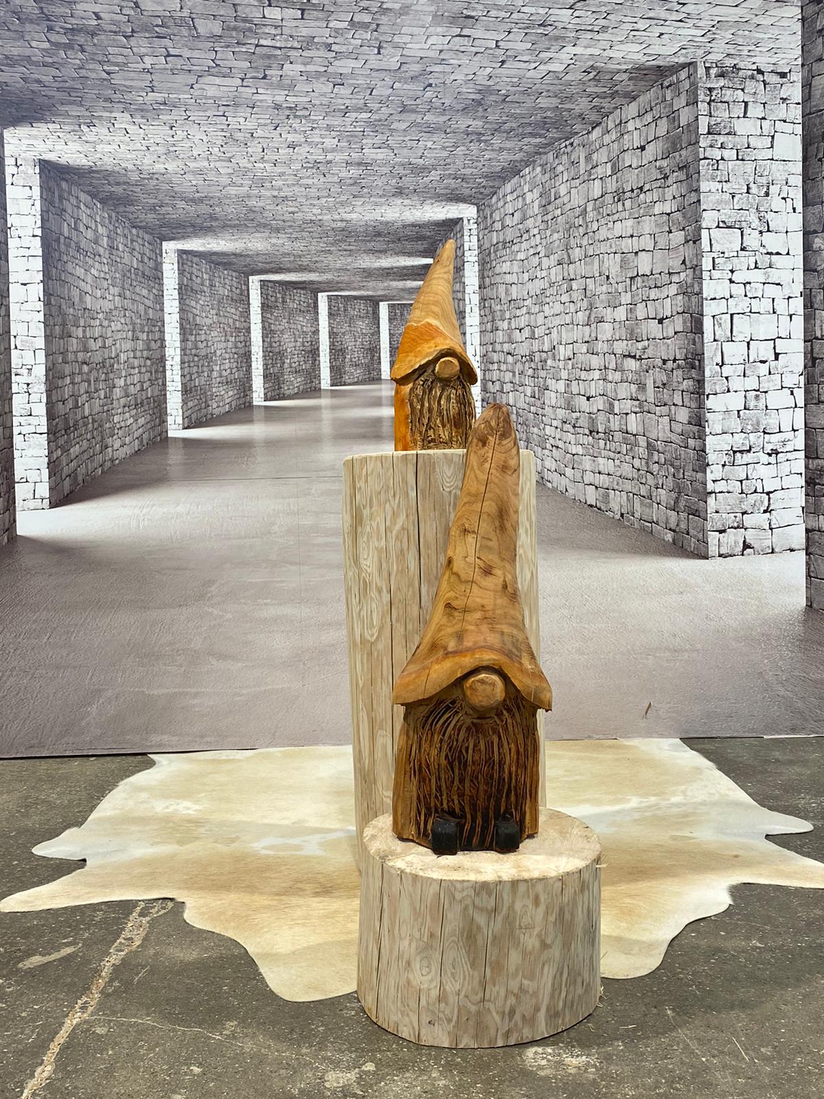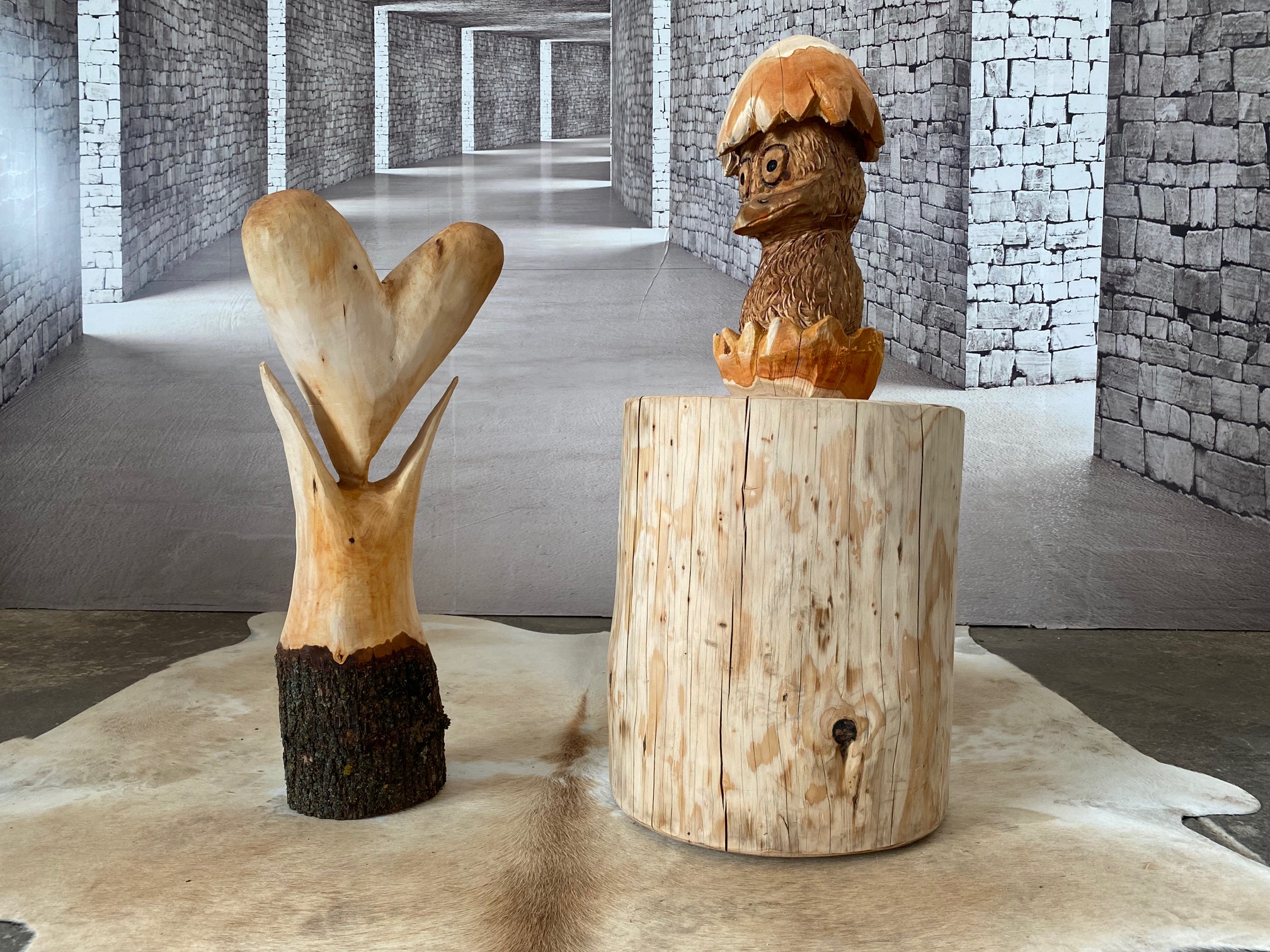 links Herz H: ca. 77cm T: ca. 18cm B: ca. 31cm – 90,00€ – rechts: Küken im Ei geflammt – H: ca. 47cm T: ca. 20cm B: ca. 20cm – 125,00€