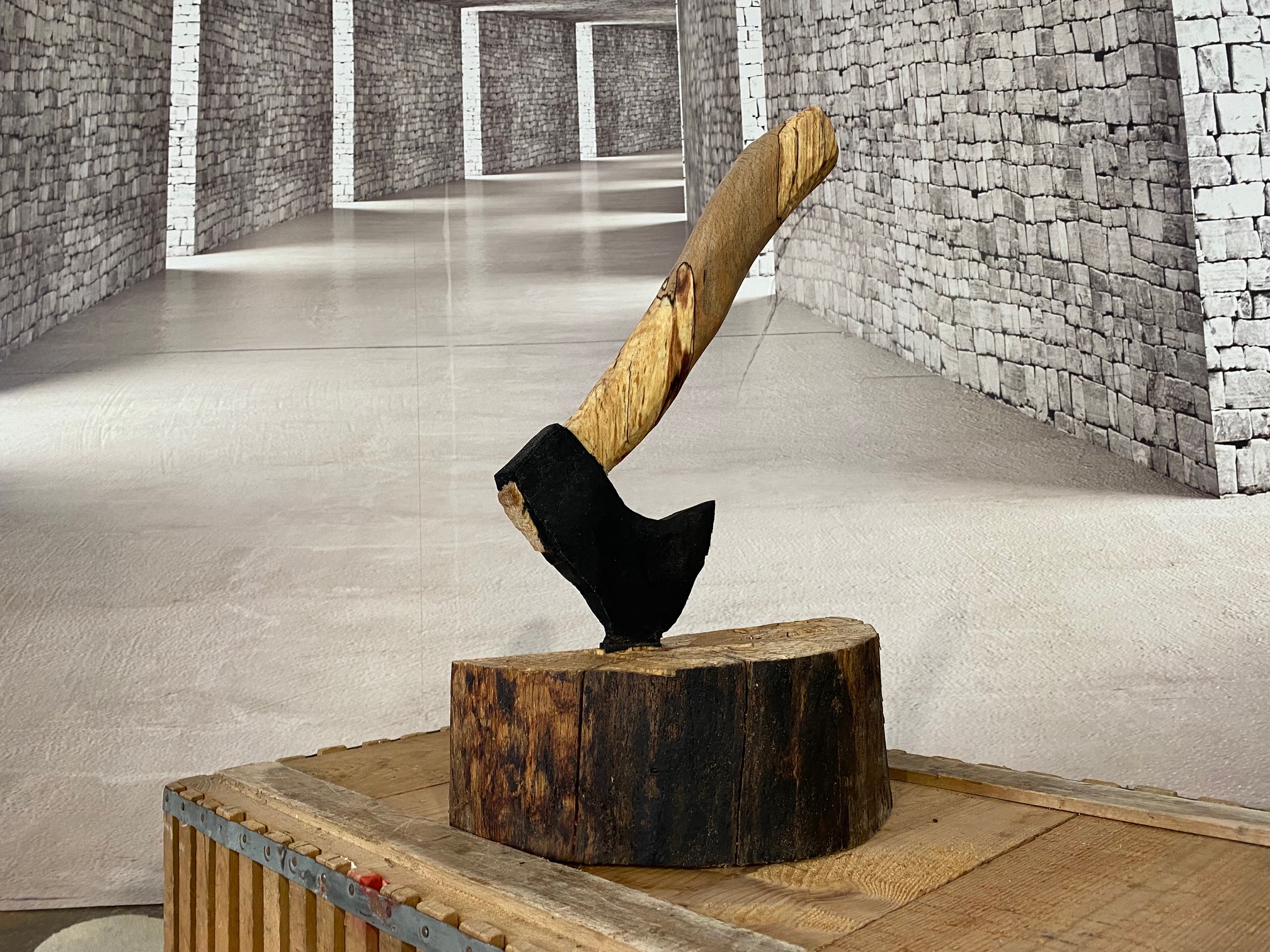 Axt im Stamm aus gestockter Buche – H: ca. 46cm T: ca. 26cm B: ca. 26cm – 90,00€